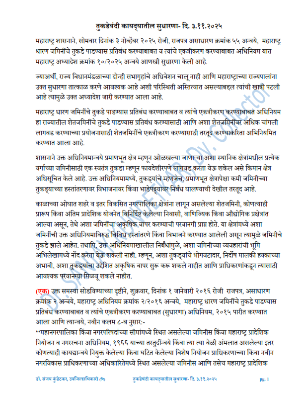 376. तुकडेबंदी कायद्यातील सुधारणा दि ३ ११ २०२५