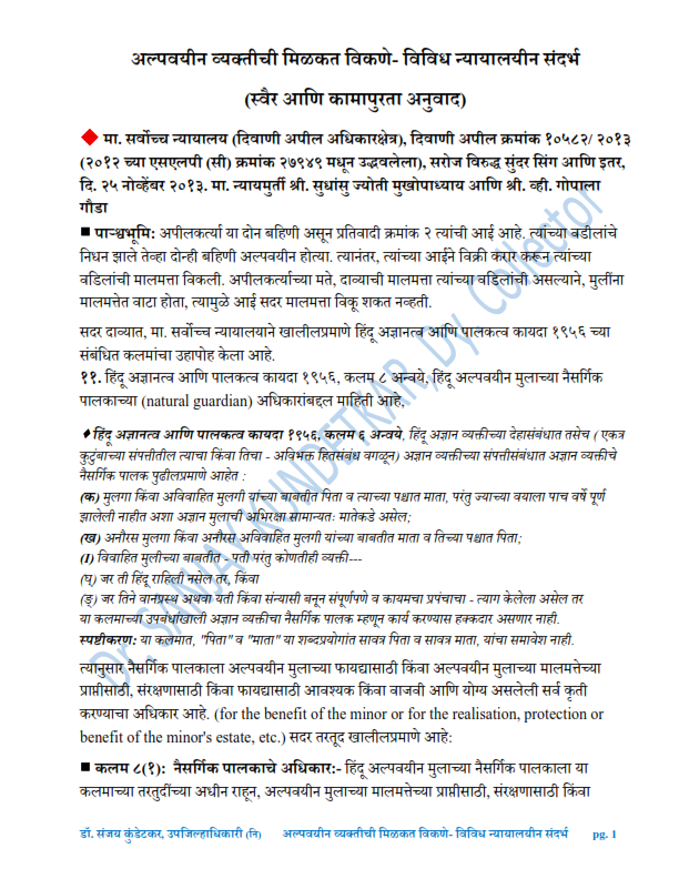 377. अल्पवयीन व्यक्तीची मिळकत विकणे विविध न्यायालयीन संदर्भ