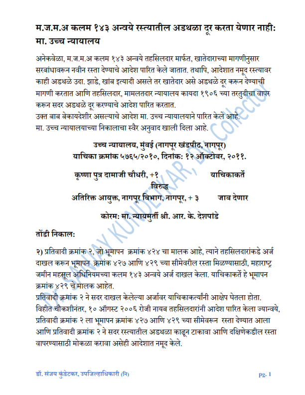 378. कलम १४३ अन्वये रस्त्यातील अडथळा दूर करता येणार नाही मा उच्च