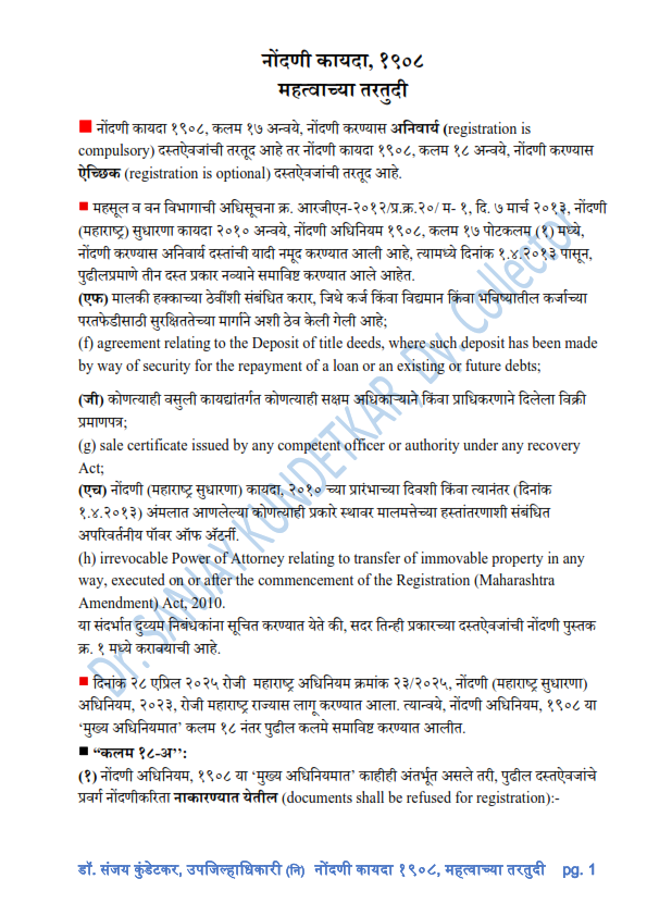 382. नोंदणी कायदा १९०८ महत्वाच्या तरतुदी